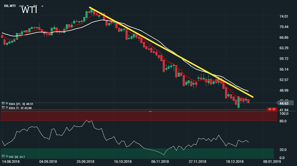 Lors de la séance asiatique et suite à la très mauvaise publication de l’indice PMI du secteur manufacturier chinois, les cours du pétrole ont reculé. Le baril de WTI s’échange à présent en deçà des 45 $. De plus, selon les données du ministère russe de l’énergie, la production de pétrole (russe) sur l’année 2018 a atteint un record post-soviétique de 11,16 millions de barils par jour (bpj). Bien qu’ayant déclaré que la production de pétrole du pays pour l’année 2019 allait baisser en raison de l’accord conclu avec l’OPEP, l’annonce du ministre n’a pas permis de soutenir les cours du pétrole. Pour rappel, la Russie (dans le cadre de cet accord conclu avec l’OPEP) s’est engagé à réduire sa production de 230 000 bpj. Malgré cela, ce sont belles et biens les craintes du ralentissement de l’économie mondiale et la hausse de la production de pétrole américain qui entrainent les cours du pétrole à la baisse. En ce début d’année 2019, les cours du WTI accusent un recul de plus de 2,60 % à 44,63 $ le baril.