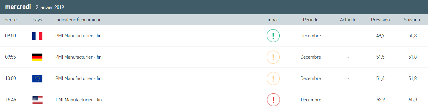 L’année boursière 2019 s’avère déjà très riche en évènements : négociation d’un accord commercial sino-américain, négociation d’un accord sur le Brexit, surabondance de l’offre de pétrole, ralentissement de l’économie mondiale, tensions géopolitiques (notamment) en Crimée et en mer de Chine. C’est dans un contexte de ralentissement du secteur manufacturier chinois pour le mois de décembre que les opérateurs de marché débutent cette année. Comme nous vous le rappelons régulièrement, les perspectives économiques de l’année 2019 ne sont pas encourageantes, et les dernières données économiques chinoises ne font que confirmer cela. Cependant, une bonne nouvelle nous vient tout droit des Etats-Unis, Donald Trump a invité les plus hauts responsables du Congrès américain des deux partis à une réunion à la Maison-Blanche afin de parvenir à un accord pour mettre fin à la fermeture partielle du gouvernement (Shutdown).
