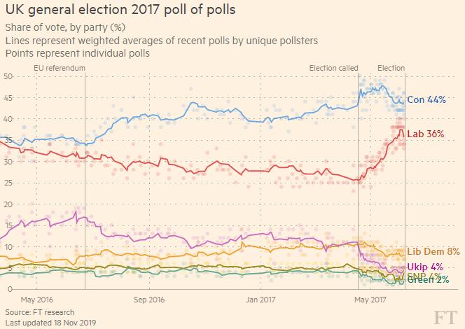 La performance meilleure que prévu des travaillistes aux élections de 2017 et la sous-performance des conservateurs ont été caractérisées par une forte augmentation de l'appui aux premiers lors de leurs campagnes respectives. L'écart entre le Parti conservateur et le Parti travailliste était encore plus marqué au début des dernières campagnes électorales et, même si l'appui aux conservateurs n'a pas beaucoup changé, le Parti travailliste a fait d'énormes progrès. Ils devront commencer à agir rapidement s'ils espèrent que cela se reproduira. Source: FT poll of polls