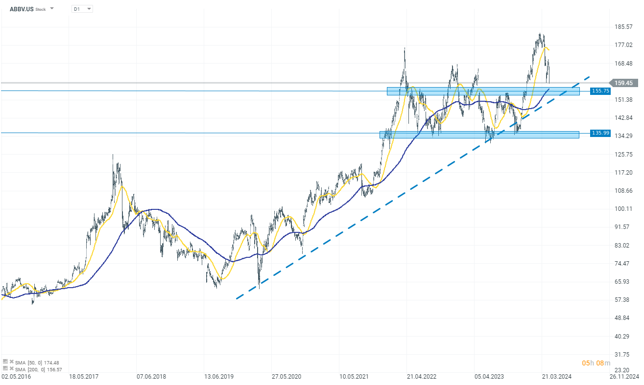 Abbvie (ABBV.US) est en baisse de près de 4,0 % après la publication de ses résultats du premier trimestre 2024. La réaction des investisseurs à la publication reflète un rapport mitigé. Les baisses peuvent principalement être attribuées aux prévisions décevantes concernant les ventes du médicament phare de l'entreprise, Humira. Cependant, plusieurs aspects du rapport peuvent attirer l'attention. La société a enregistré une augmentation significative du bénéfice dilué par action GAAP, qui a augmenté de 492,3 % pour atteindre 0,77 $, principalement en raison d'éléments non récurrents. Parallèlement, le bénéfice dilué par action ajusté a chuté de 6,1 % en glissement annuel pour atteindre 2,31 $, bien qu'il ait encore dépassé les estimations du marché.