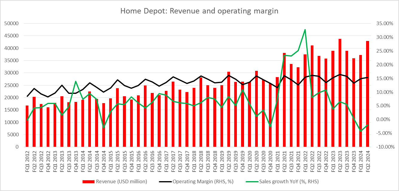 Home Depot est confronté à un ralentissement de la croissance de ses ventes depuis que le boom post-pandémie des ventes de produits d'amélioration de l'habitat s'est estompé. L'entreprise a même connu une croissance négative de ses ventes au cours des derniers trimestres. Les dernières données pour l'exercice T2 2024 (mai-juillet 2023) montrent une baisse du chiffre d'affaires de 2,0% en glissement annuel. Bien qu'il s'agisse d'une amélioration par rapport à la baisse de 4,2% en glissement annuel enregistrée au premier trimestre de l'exercice 2024, il s'agit également d'une source d'inquiétude car le deuxième trimestre de l'exercice est saisonnièrement le meilleur pour l'entreprise.