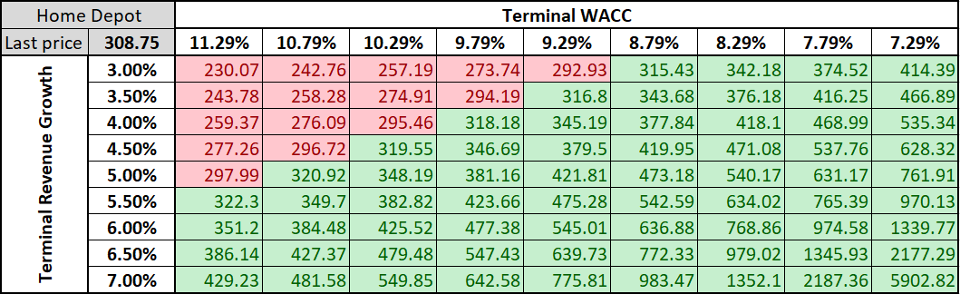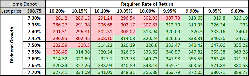 Home Depot verse régulièrement des dividendes depuis 35 ans. Bien que la distribution ait été augmentée la plupart des années, cela n'a pas toujours été le cas. La dernière fois que le dividende est resté inchangé, c'était au cours de l'exercice fiscal 2022. En tant qu'entreprise ayant de bons antécédents en matière de versement de dividendes, Home Depot peut être évaluée à l'aide du modèle de croissance Gordon. Deux hypothèses sont nécessaires ici : le taux de rendement requis et la croissance perpétuelle des dividendes. En utilisant un coût des capitaux propres de 10,00% comme taux de rendement requis et une croissance des dividendes de 7%, nous obtenons une évaluation de 326,8 $, soit environ 5% de plus que le prix actuel du marché.