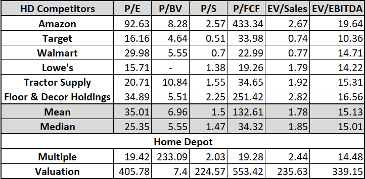 La partie supérieure du tableau ci-dessous montre 6 multiples différents pour 6 entreprises homologues de Home Depot, avec les moyennes et médianes calculées en bas. La partie inférieure montre les multiples pour Home Depot ainsi que ses valorisations calculées en utilisant les moyennes du groupe de pairs. Comme on peut le voir, l'éventail des évaluations obtenues est très large. En prenant la moyenne trimmée de ces évaluations (en excluant les évaluations P/BV les plus basses et les évaluations P/FCF les plus élevées), nous obtenons une évaluation de 301,20$, soit environ 3% de moins que le prix actuel du marché.