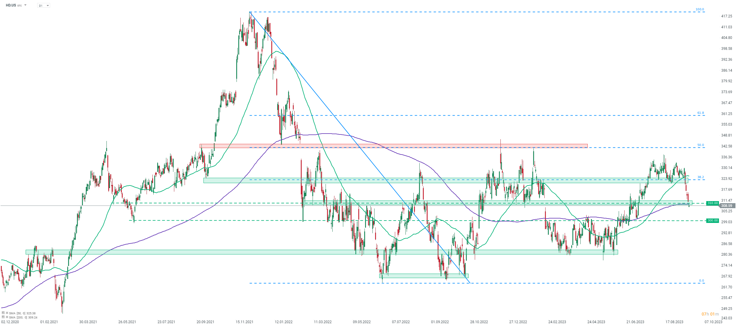 En regardant le graphique de Home Depot (HD.US) à l'intervalle D1, nous pouvons voir que le titre a été en difficulté récemment et que les baisses se sont accélérées suite à une chute en dessous de la zone de support marquée par le retracement de 38,2% du sell-off de 2021-2022. Le titre a chuté en dessous d'un autre support important suite à l'ouverture plus faible d'aujourd'hui. La zone des 310$ marquée par les réactions précédentes des prix et la moyenne mobile à 200 séances. Bien qu'une tentative soit faite pour remonter au-dessus de cet obstacle, aucun succès n'a pu être observé pour le moment. Si la baisse reprend, le prochain support à surveiller se trouve dans la zone psychologique des 300$.