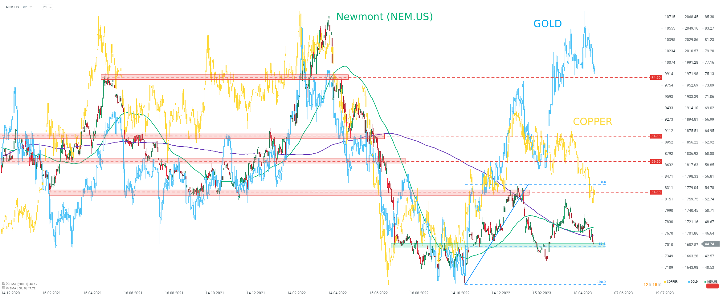 En regardant un graphique de Newmont Mining (NEM.US) tracé par rapport au GOLD (superposition bleu clair), nous pouvons voir que l'action de la société a sous-performé le métal jauen ces derniers temps. Alors que l'or a réussi à atteindre de nouveaux sommets locaux après s'être remis de la vente massive de février 2023, Newmont n'a pas réussi à remonter au-dessus du sommet de fin janvier 2023. Alors que l'OR a récemment atteint un nouveau record intrajournalier, Newmont s'échange à près de 50 % en dessous de son record d'avril 2022. Fait intéressant, les performances récentes de Newmont semblent être plus étroitement corrélées avec le COPPER (superposition jaune). Le recul récent des actions Newmont a ramené le titre sous la moyenne mobile de 200 séances (ligne violette) avec une baisse des prix vers la zone de support marquée par un retracement de 61,8 %.