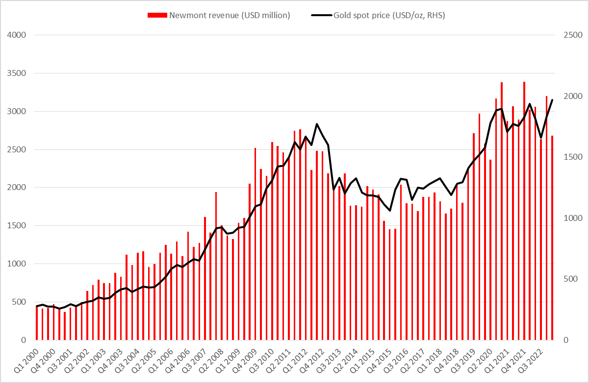 Étant donné que l'exploitation minière de Newmont est la plus grande mine d'or au monde et que l'extraction de l'or est sa principale activité, il ne faut pas s'étonner que la performance commerciale de l'entreprise soit étroitement liée au prix de l'or. Les ventes d'or ont représenté plus de 85 % des ventes de Newmont au cours de la plupart des trimestres au cours des 10 dernières années. Cependant, cette part a chuté récemment alors que le cuivre, l'argent et le zinc ont grimpé. Néanmoins, comme l'or représente toujours la majorité des ventes de Newmont, la performance commerciale de la société suit de près l'évolution du marché de l'or. Un graphique ci-dessous montre à quel point les changements dans les revenus de Newmont ont suivi les changements du prix de l'or depuis le début de 2000.