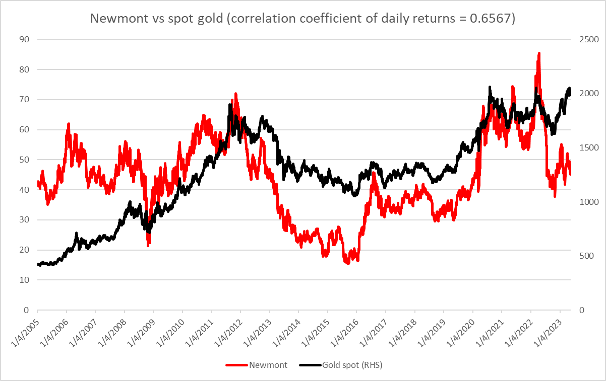 Les actions des mineurs d'or peuvent être un bon moyen de permettre aux négociants en actions à diversifier leurs portefeuilles. Les investisseurs qui, pour une raison quelconque, ne peuvent pas ajouter une exposition directe à l'or à leurs portefeuilles, via des lingots ou des contrats à terme, peuvent se tourner vers les actions des mines d'or pour une exposition indirecte au marché de l'or. Nous avons déjà montré dans l'un des paragraphes précédents qu'il existe une forte corrélation entre la performance du prix de l'or et les modèles de revenus de Newmont. Une corrélation positive décente peut également être trouvée entre le cours de l'action de Nemont et le prix de l'or au comptant. Le cours de l'action Newmont a été tracé par rapport au prix au comptant de l'or et à l'indice S&P 500 sur les graphiques ci-dessous. Comme on peut le voir, l'action Newmont a montré une bien plus grande corrélation avec l'or au cours de l'horizon de recherche (janvier 2005 - mai 2023), pour un coefficient de corrélation des rendements quotidiens de 0,6567, qu'avec l'indice S&P 500 (coefficient de 0,2807). Bien que ces corrélations ne soient pas parfaites, elles montrent que les actions Newmont se comportent davantage comme de l'or que comme un marché boursier au sens large.