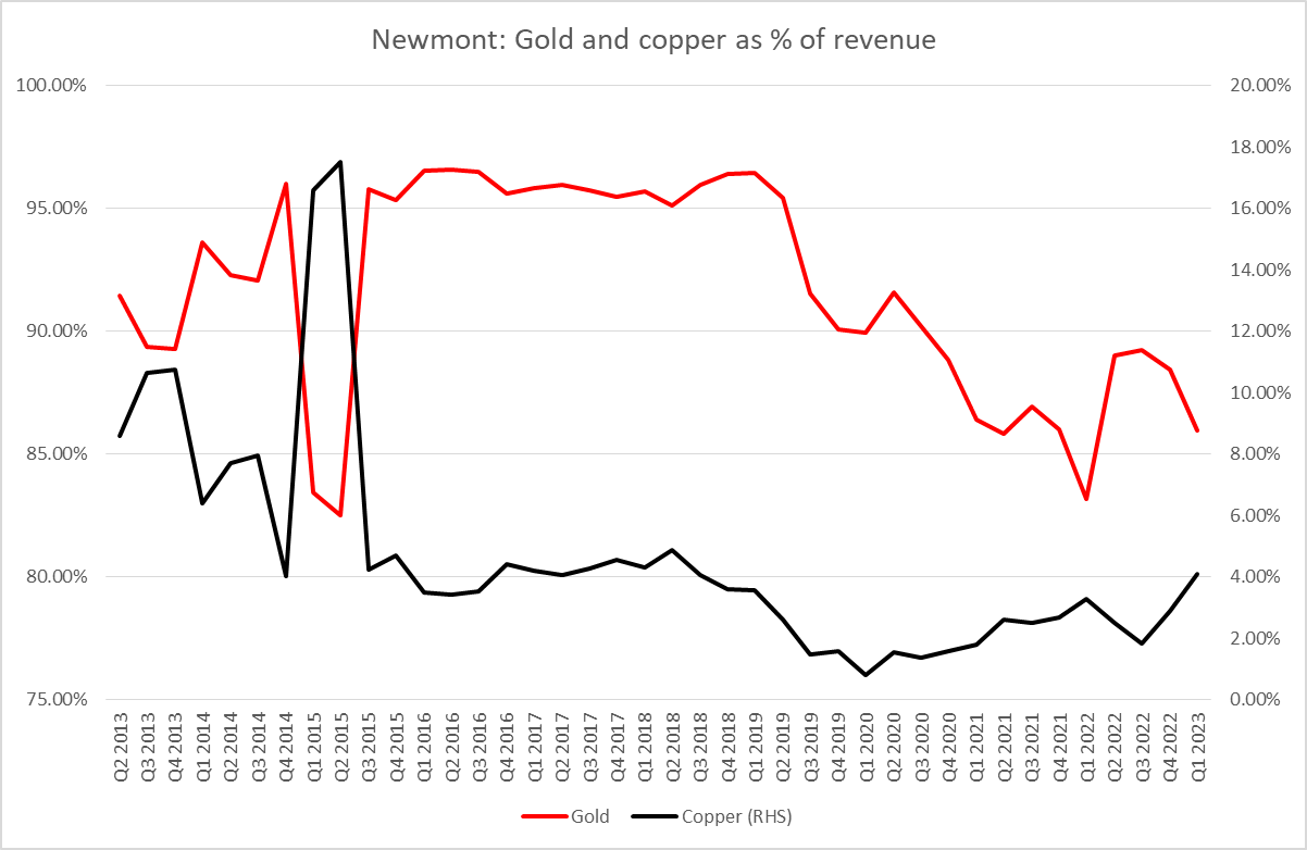 Bien que Newmont Mining Corporation et Newcrest Mining soient les deux principaux producteurs d'or au monde, il convient de noter que les mineurs d'or n'exploitent pas seuls l'or. Un certain nombre d'autres métaux, précieux ou de base, sont extraits en tant que sous-produit de l'extraction de l'or et ceux-ci constituent une source de profit supplémentaire pour l'entreprise. Newmont, dans sa dernière publication trimestrielle (T1 2023), a indiqué que l'or représentait 86 % de ses ventes. Les 14 % restants étaient constitués des ventes d'argent, de zinc, de plomb et de cuivre.