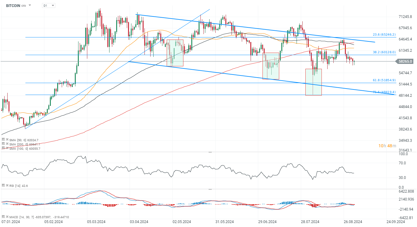 Après l'énorme rallye du bitcoin au premier trimestre, la deuxième partie de l'année est nettement plus faible pour le bitcoin. Certes, la crypto-monnaie s'échange à près de 20 % au-dessus de ses plus bas niveaux locaux de début août, lorsque le prix a momentanément plongé sous les 50 000 dollars, mais n'a pas réussi à dépasser durablement le niveau de 65 000 dollars. L'affaiblissement du dollar et l'incertitude quant à la dynamique future de l'économie américaine ne provoquent pas d'euphorie sur le marché ; la perspective d'une réduction de 100 points de base des taux de la Fed, plus tard dans l'année, n'a pas non plus suscité une nouvelle vague de demande sur le marché et pour les ETF.