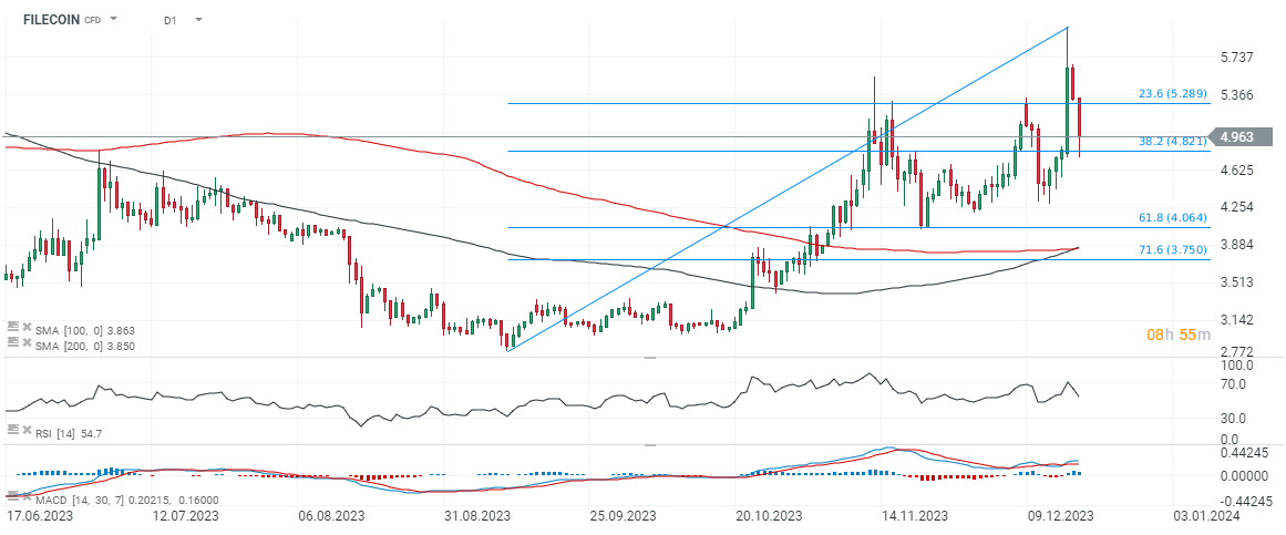 Filecoin a réussi à défendre le niveau de retracement de Fibonacci de 38,2 % de la vague ascendante d'août, et la dynamique des moyennes SMA200 et SMA100 suggère un retournement à long terme vers une tendance haussière (croisement doré). Source : xStation5