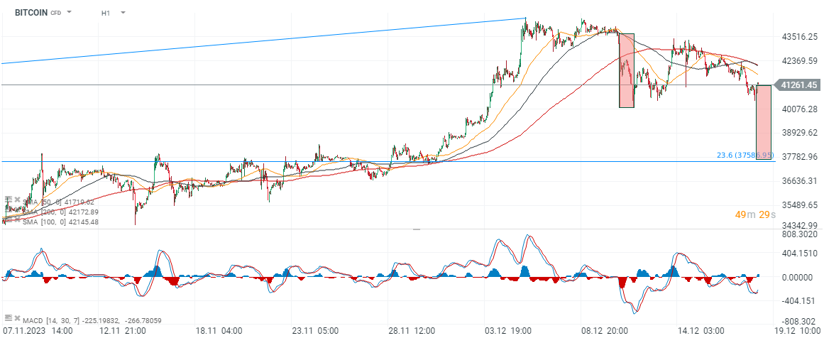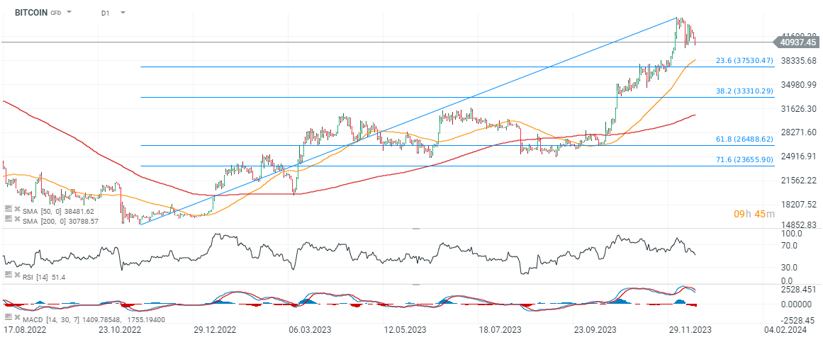 En observant le trading de Bitcoin, bien que le MACD confirme des niveaux de survente proches (sentiment faible), la dynamique des moyennes suggère potentiellement la réalisation possible d'une autre impulsion dans une correction 1:1. Une telle impulsion implique maintenant un mouvement vers 37 500 dollars, où nous observons également le retracement de Fibonacci de 38,2 % de la vague ascendante de l'automne 2022. Le niveau de 37 000 dollars semble également très solide étant donné les réactions de prix précédentes en 2023, indiquant que dans cette zone, les acheteurs peuvent être beaucoup plus actifs. Source : xStation5
