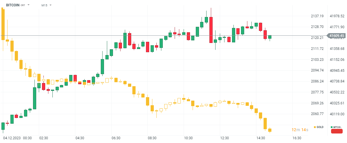 La corrélation du BITCOIN avec l'OR (graphique de l'or, GOLD) est apparente (64 % en 2023), mais à court terme, les deux actifs peuvent évoluer de manière totalement indépendante. Après que l'or ait franchi les 2150 dollars et soit revenu dynamiquement à 2070 dollars l'once, nous observons même une divergence. Source : xStation5
