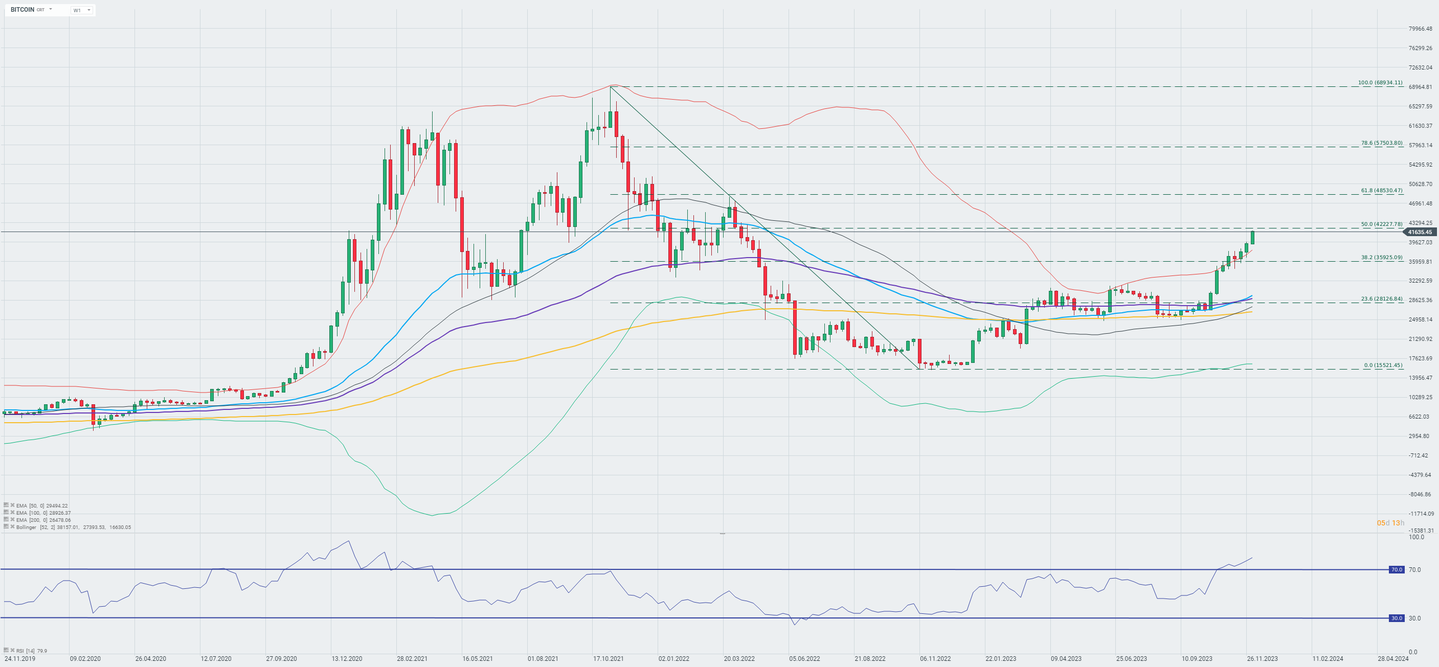Le Bitcoin s'approche de la résistance des 42 000 dollars où l'on peut observer le retracement de Fibonacci à 50,0 %. Source : xStation5