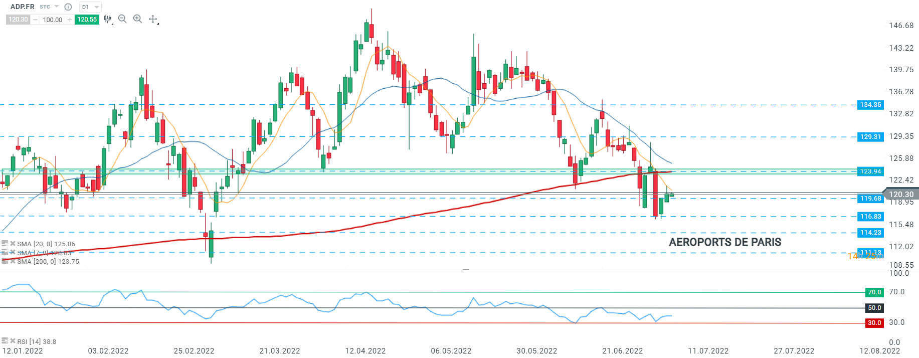 Les cours d’ADP (ADP.FR) ont entamé la troisième séance de la semaine à la hausse, testant, au moment de la rédaction de ces lignes, la zone où coïncide la SMA 7 (ligne orange) à 120,74. En cas de franchissement de ce niveau, le mouvement haussier pourrait s’étendre en direction de la résistance à 123,94. Toutefois, on remarque d’un point de vue technique que le RSI évolue en dessous de la zone de neutralité de 50 ce qui signifie que les vendeurs ont toujours l’avantage. Source : xStation5