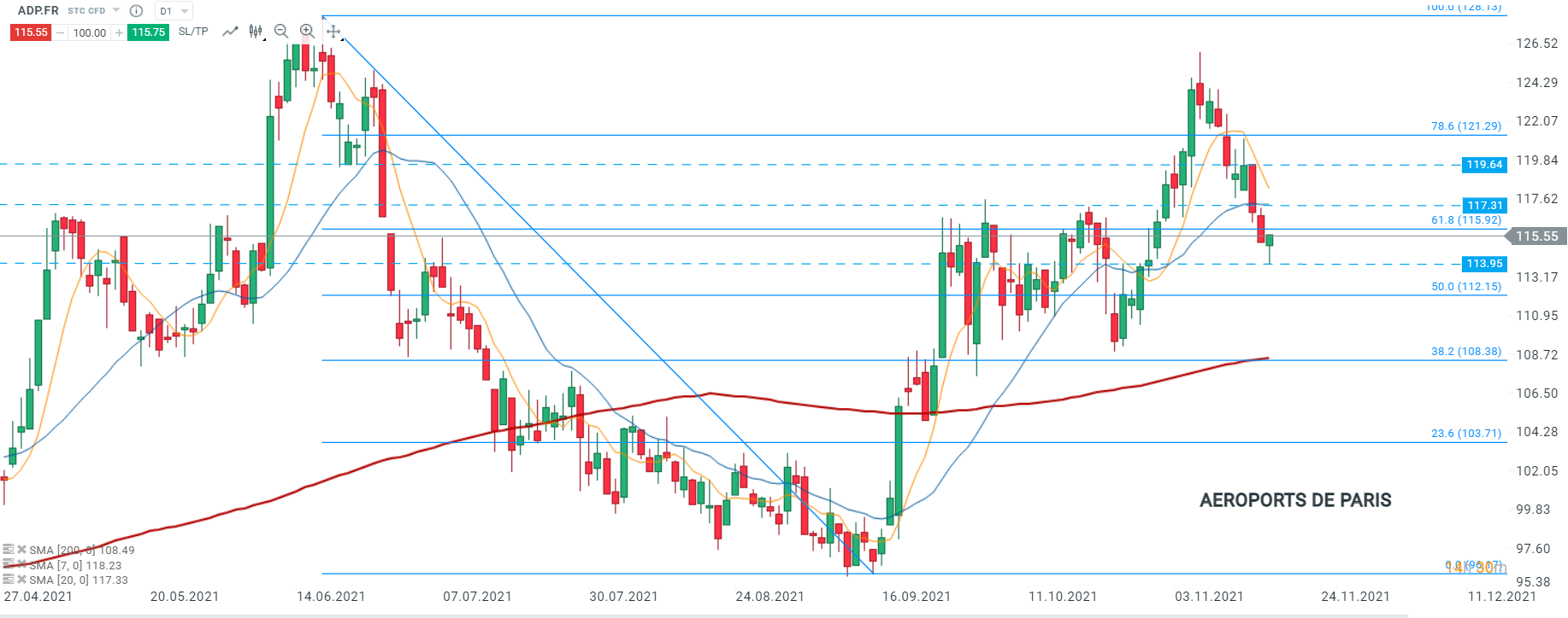 Les cours d’Aéroports de Paris (ADP.FR) ont ouvert à la hausse aujourd’hui, portés par les chiffres optimistes de la hausse du trafic de passagers. Au moment de la rédaction de ces lignes, les cours prennent appui sur le support à 113,95 pour se hisser au-dessus de la résistance à 115,92 où se trouve le retracement de Fibonacci à 61,8% de la baisse entamée le 17/06. Néanmoins, toute nouvelle qui risquerait de fragiliser la reprise du trafic aérien lié au Covid-19 pourrait inverser la tendance et dans un tel scénario, un retour au support de 113,95 ne peut être exclu. Source : xStation5