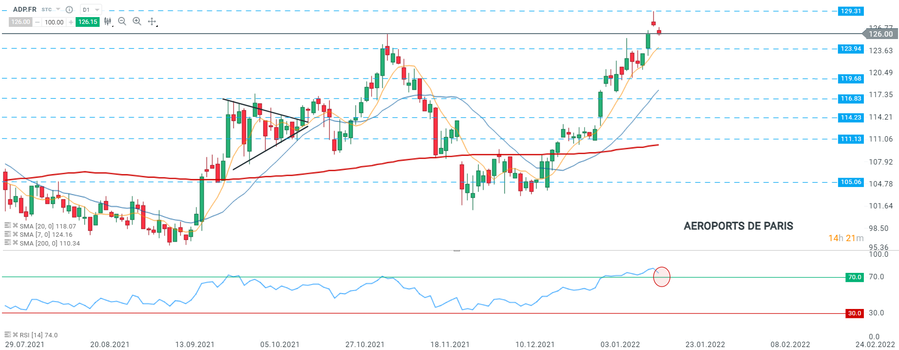 Les cours d’Aéroports de Paris (ADP.FR) ont ouvert à la baisse, les nouvelles négatives sur de nouvelles restrictions liées au Covid continuent de peser sur le secteur aérien. Au moment de la rédaction de ces lignes, les cours se dirigent vers le niveau de support à 123,94. D’un point de vue technique, on remarque que le RSI s’apprête à franchir à la baisse la zone de surachat de 70, ce qui fournirait un signal de vente. Toutefois, toute nouvelle relative à l’amélioration de la situation sanitaire pourrait inverser la tendance et le mouvement haussier pourrait alors reprendre en direction de la résistance à 129,31. Source : xStation5