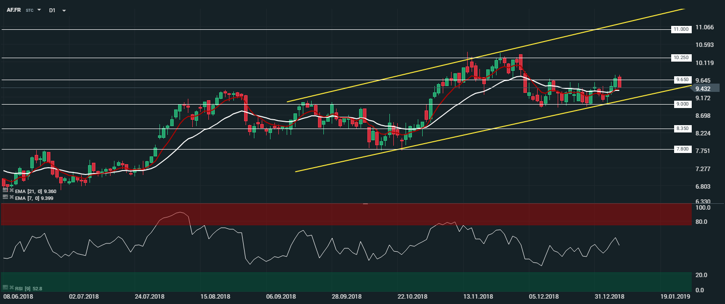 En unité de temps journalière (D1), le titre Air France (AF.FR) évolue au sein de son canal haussier matérialisé depuis le mois d’octobre 2018. Les cours sont portés par les moyennes mobiles à 7 et 21 périodes. Le RSI est orienté à la baisse proche de sa zone de neutralité et oscille à 54,2 points. Dans ce contexte, nous serons haussiers sur le titre avec comme objectif le niveau des 11 €.