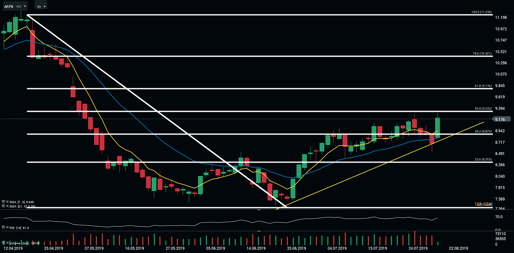 Après avoir navigué en territoire négatif mercredi, le titre gagne plus de 5 % en séance. Soutenus par les moyennes mobiles de court terme, les acheteurs sont parvenus à rallier les 9,32 euros (correspondants aux 50 % des retracements de Fibonacci). Pour l’heure, vendeurs et acheteurs se neutralisent autour des 9,17 euros.