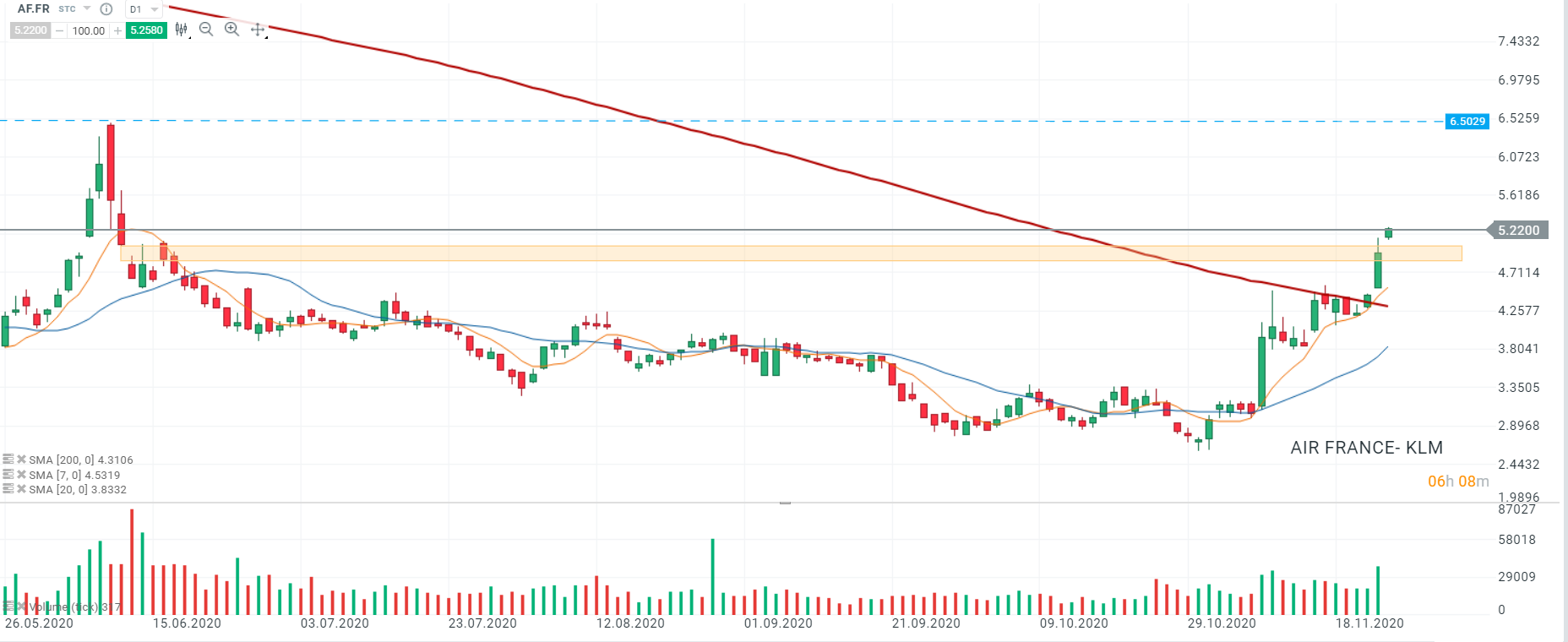 Les cours d’Air France- KLM (AF.FR) ont ouvert avec un important gap haussier. Le mouvement haussier a été confirmé par le passage au-dessus de la zone comprise entre 4,8447 et 5 (zone orange) et les cours se dirigent à présent vers les sommets de juin à 6,5029. Source : XStation5
