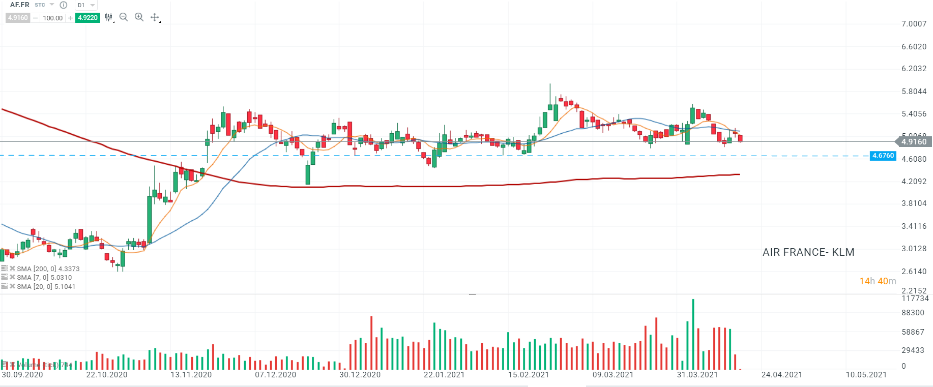 Le titre Air France (AF.FR) poursuit son mouvement latéral et entame la séance d’aujourd’hui à la baisse, le secteur aérien continuant de souffrir des restrictions liées au coronavirus. Au moment de la rédaction de ces lignes, les cours se dirigent vers la zone de support à 4,6760. Si le sentiment actuel prévaut, la baisse pourrait se poursuivre vers le creux du 26/01 au niveau des 4,4355. Source : xStation5