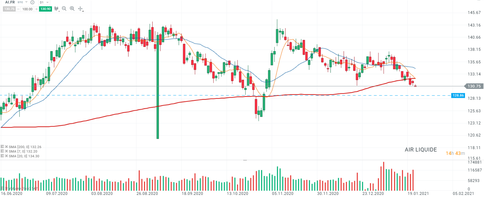 Les cours d’Air Liquide (AI.FR) ont ouvert avec un léger gap baissier et se dirigent vers la zone de support à 128,86. En cas de cassure de ce niveau, le mouvement baissier pourrait s’accélérer vers le creux du 02/11 à 125,61. Source : xStation5