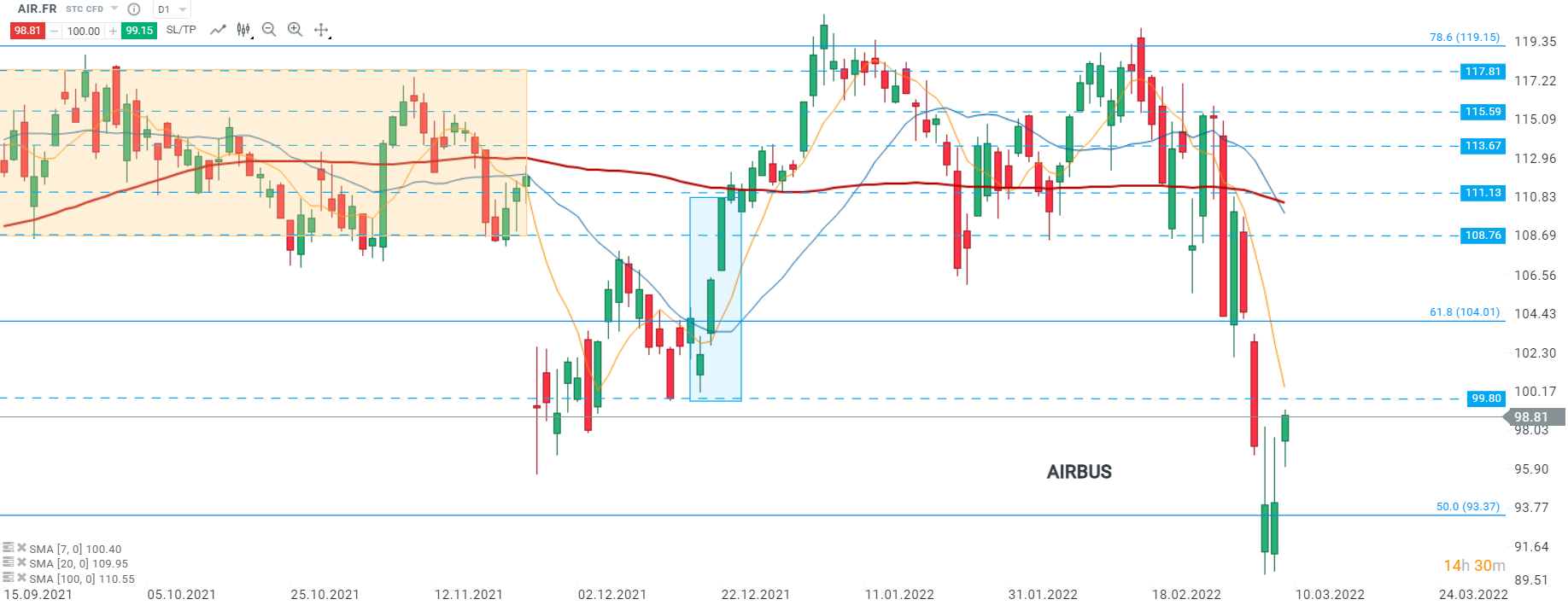 Les cours d’Airbus (AIR.FR) ont ouvert avec un important gap haussier, portés par les nouvelles positives sur les chiffres des commandes et des livraisons. Au moment de la rédaction de ces lignes, les cours se dirigent vers la résistance à 99,80. Toutefois, s’ils ne parviennent pas à franchir le niveau susmentionné, un retour au support à 93,37 où coïncide le retracement de Fibonacci à 50% de la baisse de février 2020 serait à envisager. Source : xStation5