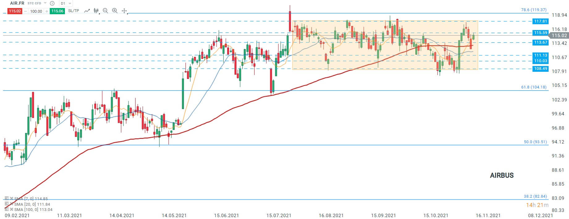 Les cours d’Airbus (AIR.FR) évoluent de manière latérale au sein d’un range intégré le 30/07 et ont entamé la séance d’aujourd’hui à la hausse portés par la nouvelle positive de la commande d’Indigo Partners. Au moment de la rédaction de ces lignes, les cours tentent de franchir la résistance à 115,59, dernier rempart avant la borne supérieure du range à 117,81. Toutefois, si les vendeurs prennent l’avantage, le support de 111,13 serait à envisager. Source : xStation5