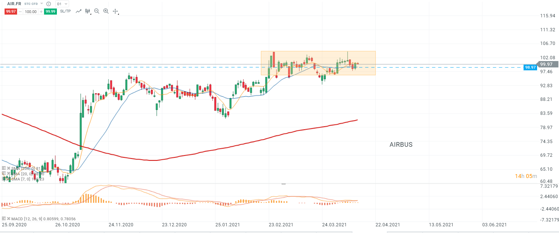 Le titre Airbus (AIR.FR) reste sous pression soumis aux restrictions liées au coronavirus qui s’accentuent dans plusieurs pays et poursuit son mouvement latéral au sein du range (rectangle jaune), se repliant vers la SMA 20 (ligne bleue) à 98,87 au moment de la rédaction de ces lignes. En cas de cassure de ce niveau, le mouvement baissier pourrait s’étendre à la limite inférieure du range à 96,43. D’un point de vue technique, on remarque également que la courbe MACD et la courbe Signal sont sur le point de se croiser. Les investisseurs devront donc être attentifs quant au sens du croisement qui donnera un signal d’achat ou bien de vente. Source : xStation5