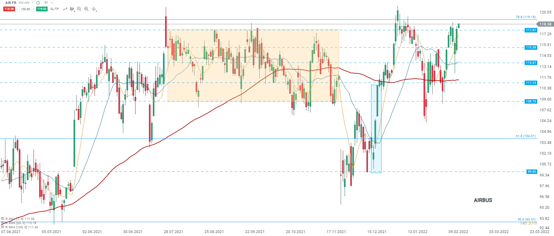 Les cours d’Airbus (AIR.FR) ont entamé leur 8ème séance consécutive à la hausse, portés par les nouvelles rassurantes concernant le conflit en Ukraine. Au moment de la rédaction de ces lignes, les cours se préparent à un test de la résistance à 119,15 où coïncide le retracement de Fibonacci à 78,6% de la baisse de février 2020. En cas de franchissement, la prochaine cible pour les acheteurs constitue la résistance à 122,23. Toutefois, en cas d’échec, un repli en direction du support à 117,81 ne peut être exclu. Source : xStation5