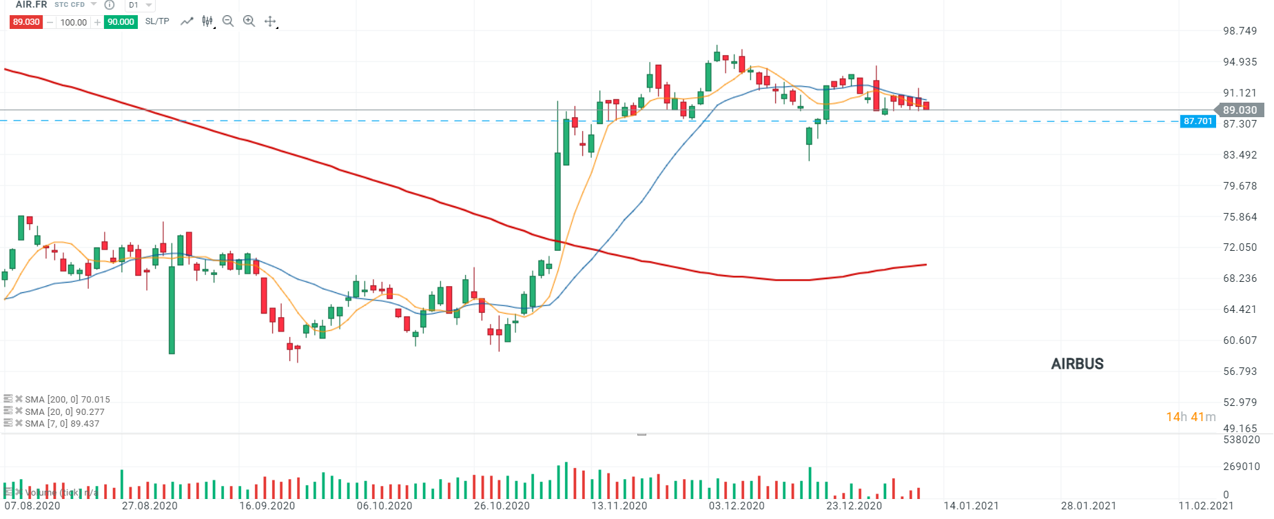 Les cours d’Airbus (AIR.FR) ont ouvert avec un léger gap haussier et se replient actuellement sous la pression de la SMA 20 (ligne bleue) Les cours se dirigent vers la zone de support à 87,701 et en cas de cassure de ce niveau, le mouvement baissier pourrait s’accélérer vers le creux du 21/12 à 82,818. Source : xStation5