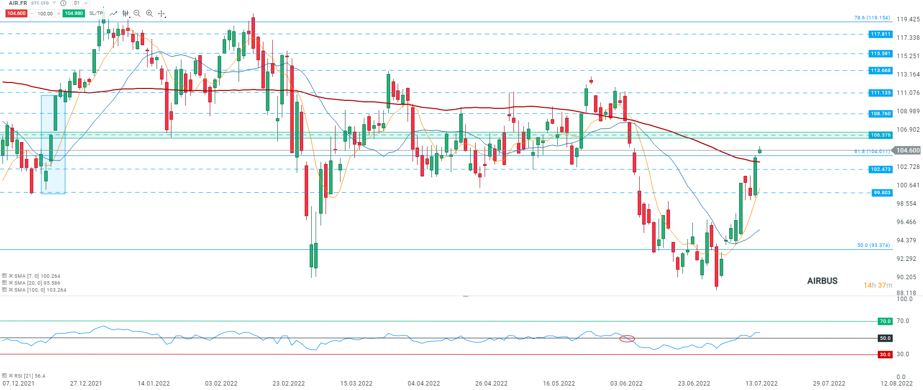 Les cours d’Airbus (AIR.FR) ont entamé la première séance de la semaine à la hausse, franchissant la résistance à 104,011 où coïncide le retracement de Fibonacci à 61,8% de la baisse de février 2020. Au moment de la rédaction de ces lignes, les cours tentent de franchir la résistance à 106,376/ On remarque d’un point de vue technique que le RSI évolue au-dessus de la zone de neutralité de 50, ce qui signifie que les acheteurs ont toujours l’avantage sur le marché. Source : xStation5
