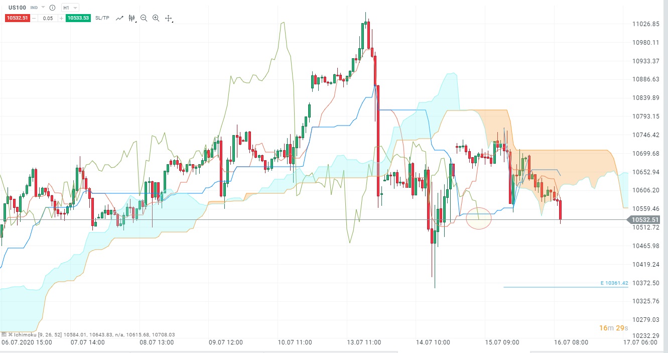 D’un point de vue technique, le Nasdaq est sur le point de donner un signal baissier en sortant de son nuage par le bas. Ce signal sera confirmé si la Chikou span franchi la Kijun (ellipse jaune) à la clôture du chandelier H1.