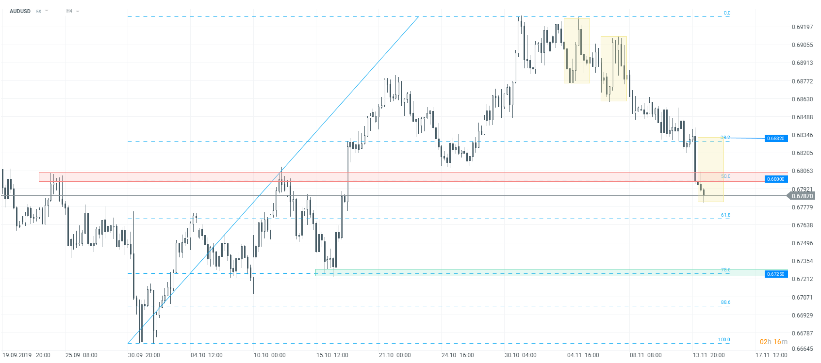 Le rapport sur l'emploi de l'Australie a été publié lors de la session asiatique. Le taux d'emploi est resté à 5,3% mais la variation de l'emploi de -19,0K a été beaucoup plus faible que prévu, soit une augmentation de 15k. Les données d’aujourd’hui devraient permettre à la RBA de ralentir et d’améliorer les chances d’une réduction en décembre. L'AUDUSD a dépassé le support clé à 0.6800, où se trouve le retracement de Fibonacci à 50%. Une pause plus basse a ouvert la voie à un déclin plus important. Il y a une chance pour un mouvement vers le support à 0.6725. Toutefois, il convient de garder à l’esprit que le retracement de 61,8% pourrait servir de niveau de support local. En revanche, une cassure au-dessus de la poignée 0.6800 peut déclencher un mouvement ascendant vers la résistance principale - la limite supérieure d'une structure Overbalance locale (0.6832).