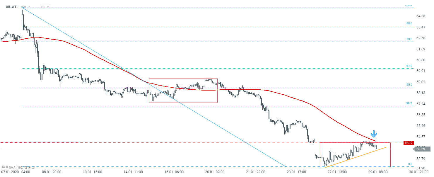 Le marché pétrolier évolue à la baisse depuis le 8 janvier. Le prix rebondit à partir de la limite supérieure de la structure de "Overbalance" aujourd'hui. Cette résistance est également confirmée par la moyenne mobile sur 100 périodes. Une cassure en dessous de la ligne de tendance marquée en jaune peut déclencher un mouvement à la baisse vers des creux récents. D'un autre côté, une cassure au-dessus de 54,10 pourrait voir la correction à la hausse s'accélérer.