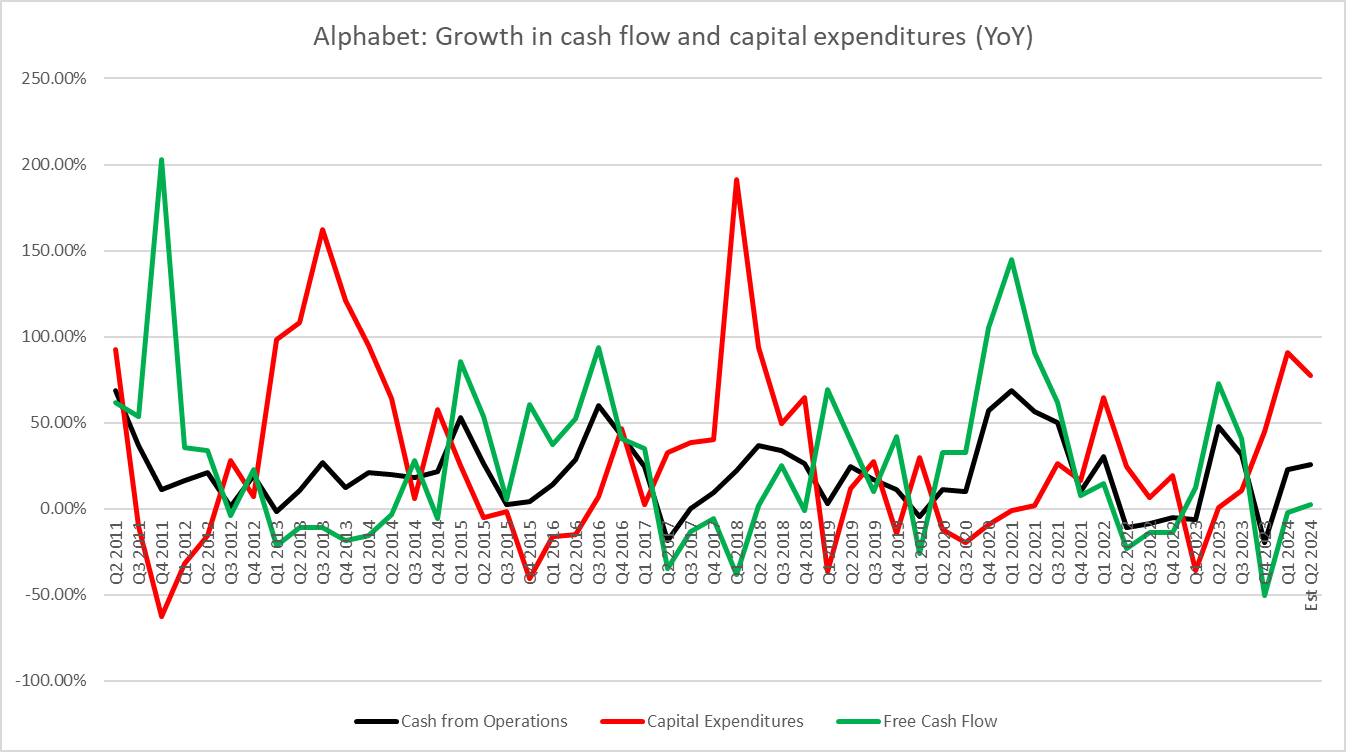 Cependant, ces trois aspects sont interconnectés. Le déploiement des fonctionnalités d'IA augmente le temps passé sur les sites d'Alphabet, ce qui, à son tour, booste les revenus publicitaires. De plus, l'offre Vertex AI d'Alphabet devrait stimuler la croissance des revenus de Google Cloud. Alphabet investit massivement dans l'IA, ce qui entraîne une augmentation des dépenses en capital. Cette hausse des dépenses en capital est susceptible de limiter la croissance du flux de trésorerie disponible, qui devrait peu changer au T2 2024 par rapport au T2 2023.