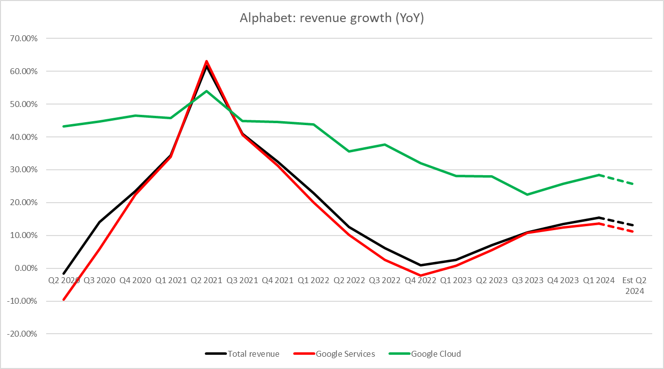 Alphabet devrait annoncer ses résultats du deuxième trimestre 2024 aujourd'hui après la fermeture des marchés américains. La société devrait enregistrer une croissance de 13,1 % de ses revenus totaux par rapport à l'année précédente, ce qui marquerait un ralentissement par rapport aux 15,4 % de croissance observés au premier trimestre 2024. Un ralentissement de la croissance est prévu dans les deux principaux segments : Google Services (qui inclut les revenus publicitaires) et Google Cloud. Cependant, la croissance dans le secteur du cloud devrait rester robuste, autour de 25 % en glissement annuel.