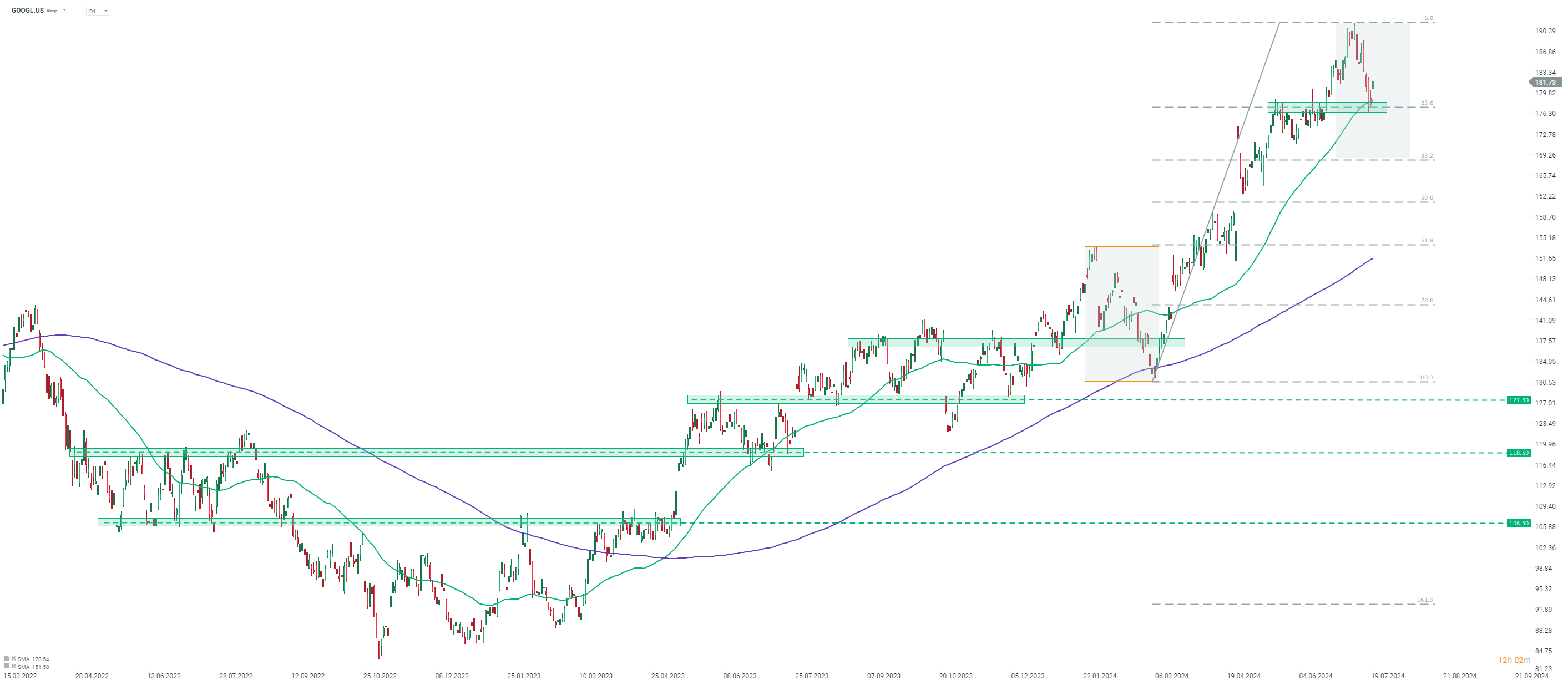 Alphabet (GOOGL.US) connaît une forte tendance haussière depuis plus d'un an et demi, avec une hausse de plus de 100 % depuis les creux de fin 2022. La montée en puissance s'est accélérée en mars 2024, avec une augmentation d'environ 40 % depuis lors. Un recul a eu lieu récemment au milieu d'une vente dans le secteur technologique, mais il semble avoir été stoppé dans une zone importante. La zone des 177,50 $, qui a interrompu la correction, est marquée par la moyenne mobile sur 50 séances (ligne verte) ainsi que par le retracement de 23,6 % de l'impulsion haussière lancée en mars 2024. C'est un développement positif pour les haussiers d'un point de vue technique et cela pourrait annoncer un retour aux sommets historiques. Toutefois, beaucoup dépendra de la publication des résultats d'aujourd'hui. Si l'entreprise déçoit avec ses résultats ou ses prévisions, cela pourrait exercer une pression sur le prix de l'action. En cas de rupture sous la zone des 177,50 $, le prochain support à surveiller pourrait se situer autour des 168,50 $, où l'on trouve la limite inférieure de la structure Overbalance et un retracement de 38,2 %.