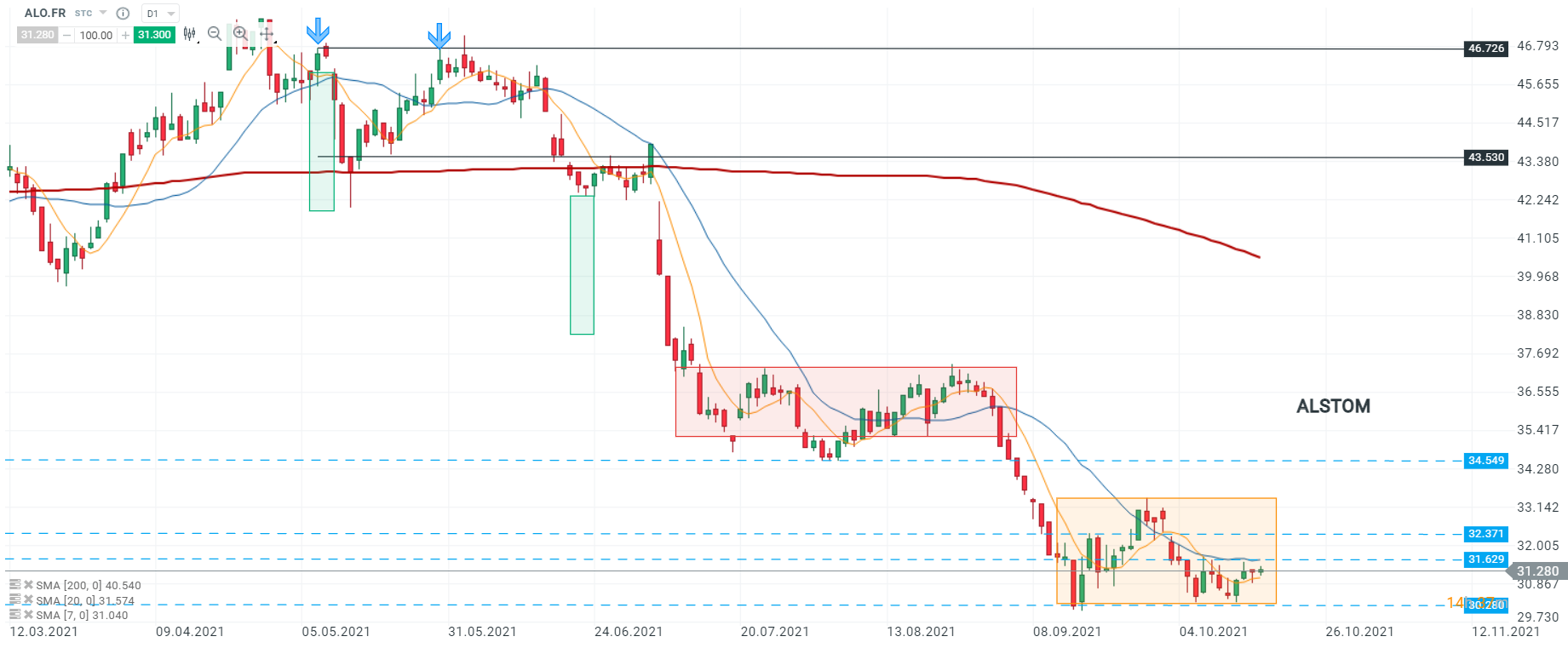 Les cours d’Alstom (ALO.FR) évoluent au sein d’un range latéral depuis le 08/09 et ont ouvert aujourd’hui à la hausse, portés par la nouvelle positive de la commande des nouvelles rames pour la région Île-de-France. Les cours tentent de franchir la SMA 20 (ligne bleue) au moment de la rédaction de ces lignes. En cas de succès, le mouvement haussier pourrait s’étendre en direction de la borne supérieure du range à 33,477. Toutefois, en cas d’échec, un retour à la borne inférieure à 30,265 serait à envisager. Source : xStation5