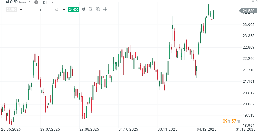 À la suite de cette annonce, l’action Alstom évolue en hausse de 1,7% aujourd'hui. Les actions Alstom continuent dans leur canal haussier depuis les plus bas de janvier 2024.