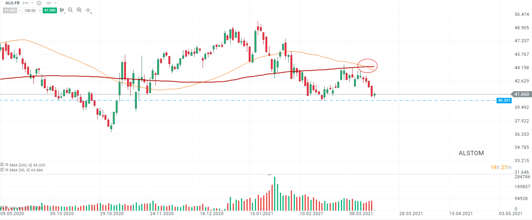 Le titre Alstom (ALO.FR) tente de rebondir aux portes du récent creux au niveau des 40,351. Si le sentiment actuel prévaut, le mouvement haussier pourrait s’étendre vers la zone de résistance à 44,017. Cependant, on observe d’un point de vue technique le croisement à la baisse, le 16/03, de la SMA 50 (ligne orange) et de la SMA 200 (ligne rouge) formant ainsi un “death cross”, signal baissier important. De ce fait, en cas de cassure du support au niveau des 40,351, une impulsion à la baisse vers le creux d’octobre 2020 à 38,05 pourrait être initiée. Source : xStation5