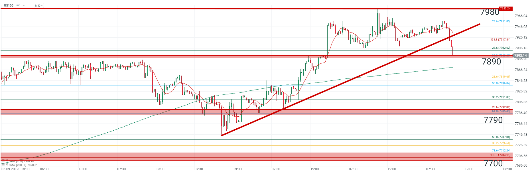 Pour l’heure l’US100 est venu chercher son support sur la zone des 7890 points avant de tenter un rebond. Source : xStation5.