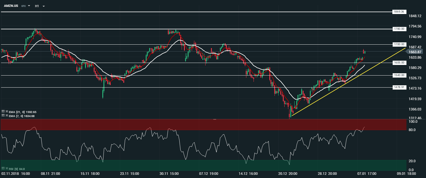En unité de temps 1 heure (H1), le titre Amazon (AMZN.US) évolue en tendance haussière. Les cours sont portés par les moyennes mobiles à 7 et 21 périodes. Le RSI est orienté à la hausse au sein de sa zone de « sur achat » et oscille à 83,7 points. Dans ce contexte, nous attendons un retour sur le niveau des 1 605 $ afin d’initier une position d’achat sur le titre avec comme objectif le niveau des 1 780 $.