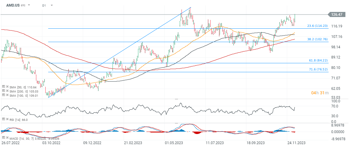 Les actions d'Advanced Micro Devices (AMD.US) connaissent une hausse de plus de 8 % aujourd'hui. Cette augmentation fait suite à la présentation hier de la puce AI Instinct MI300X, qui devrait concurrencer directement les puces de Nvidia. Meta (META.US) et Microsoft (MSFT.US) ainsi qu'OpenAI ont déjà déclaré qu'ils commanderont de nouvelles puces chez AMD, un signal fort d'un intérêt et d'une demande très importants pour le produit en 2024. La société a doublé la valeur attendue du marché des puces AI. Selon la PDG d'AMD, Lisa Su, ce marché vaudra environ 400 milliards de dollars sur une période de quatre ans, comparé à une estimation précédente de 200 milliards de dollars, indiquant une demande corporative très élevée.