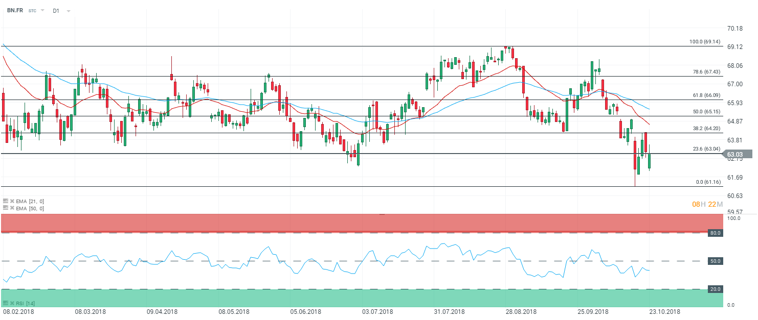 En unité de temps journalière (D1), le titre Danone (BN.FR) évolue au sein de sa zone de range identifié depuis ce mois de février, dans une zone comprise entre 61,15 € et 69,15 €. Les cours semblent buter sur le niveau des 63,00 € - correspondant aux 23,6 % des retracements de Fibonnaci. Les prix sont capés par les moyennes mobiles à 21 et 50 périodes. Le RSI évolue en deçà de sa zone de neutralité et oscille à 39 points. Dans ce contexte, nous avons un biais haussier sur l’actif avec en ligne de mire le niveau des 64,00 € puis le niveau des 65,00 € par extension.