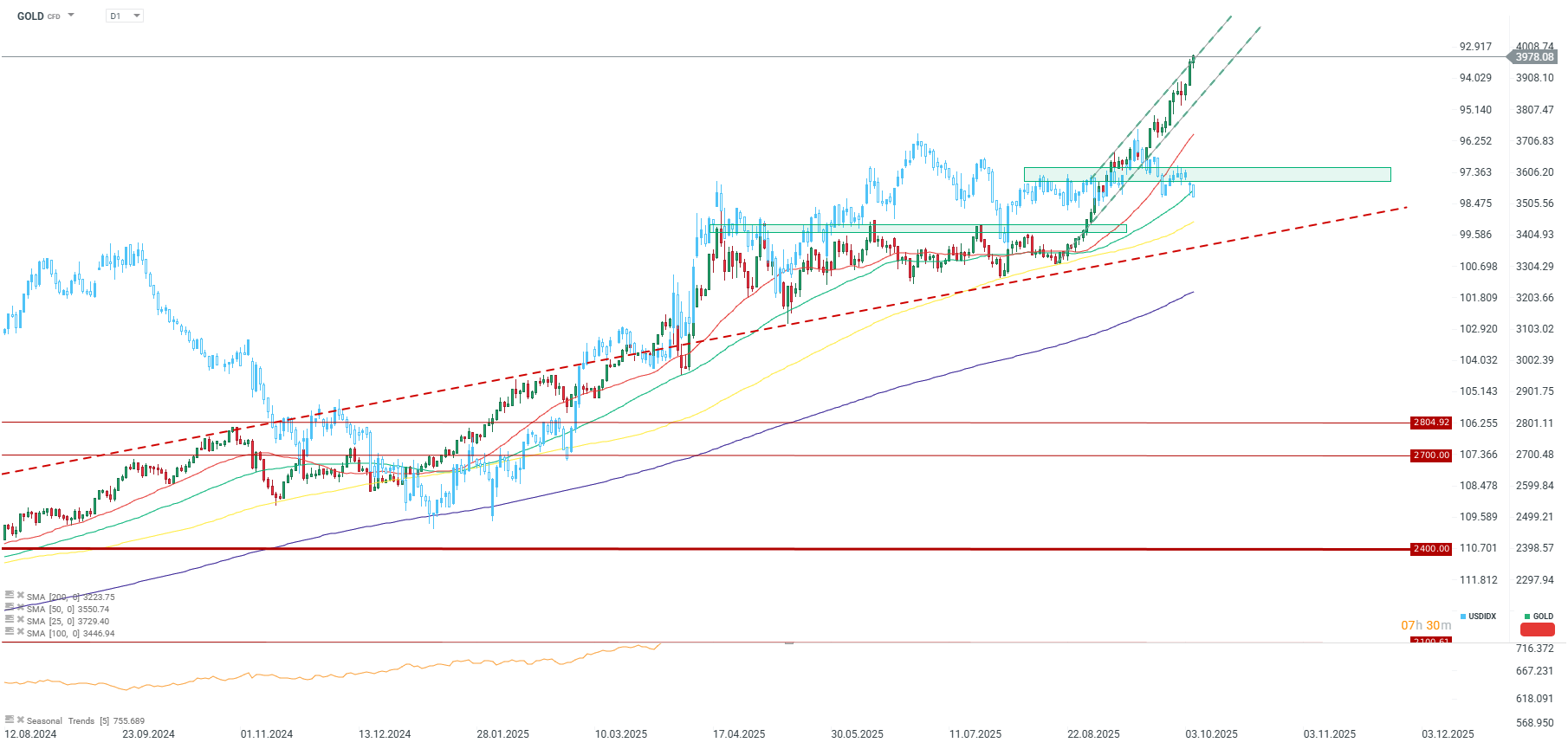 - L'or a enregistré une hausse de près de 2 % en début de semaine et a poursuivi sa remontée au cours de la deuxième séance, approchant le niveau de 4 000 dollars l'once. La hausse depuis le début de l'année s'élève à environ 50 %.