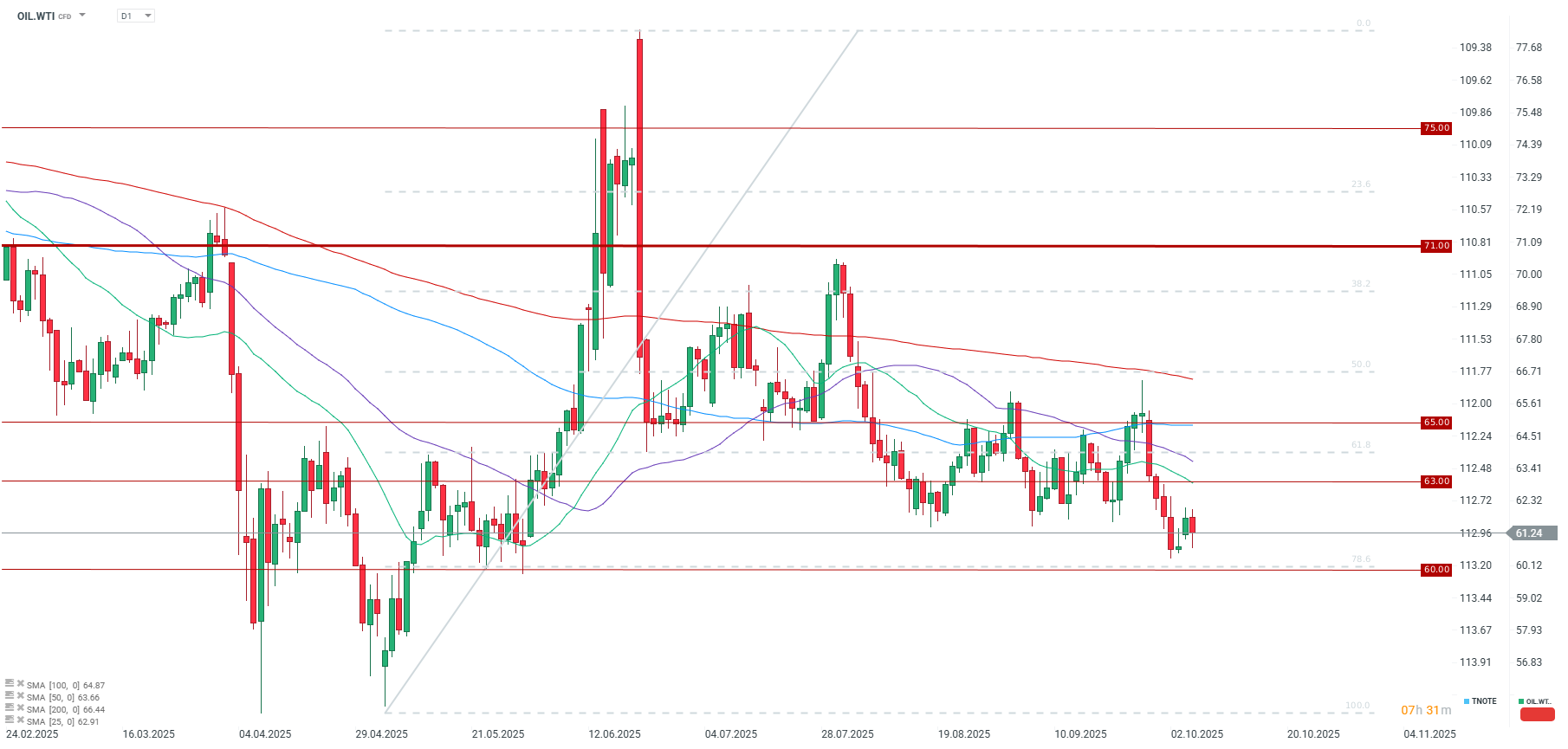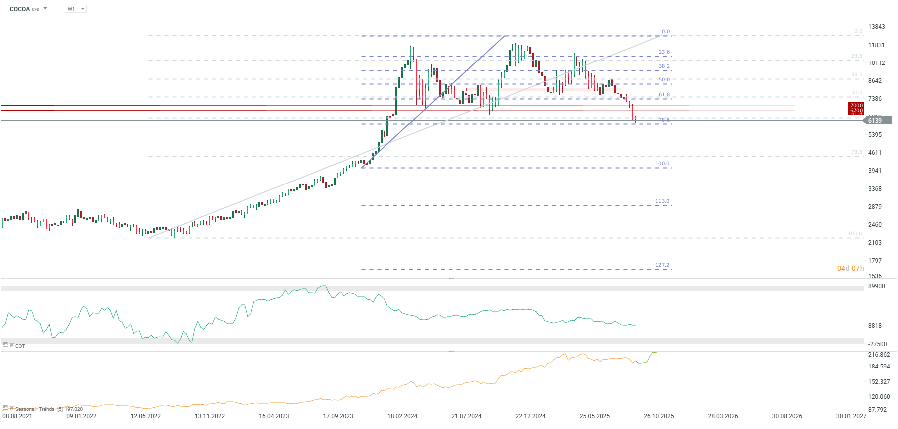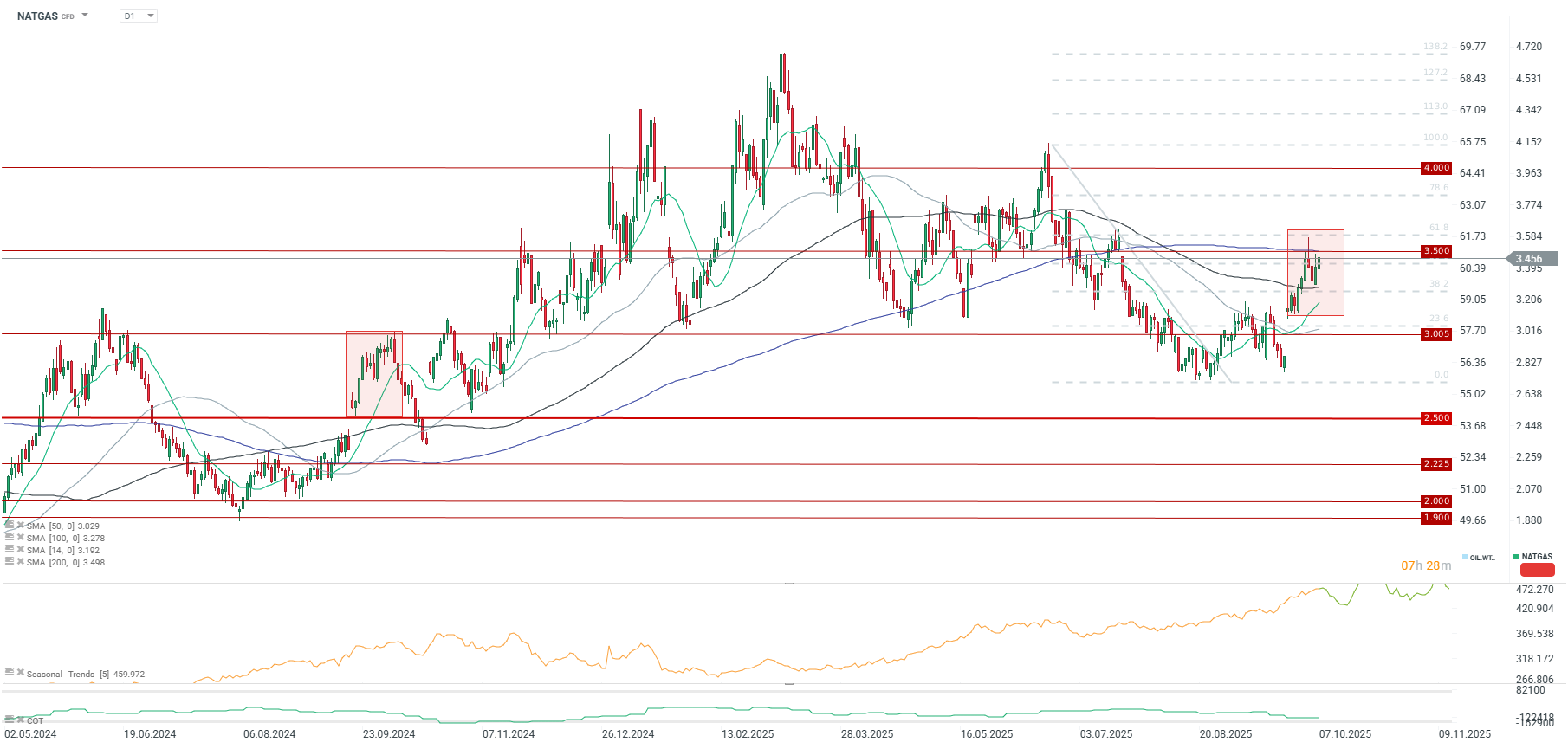 Le prix du gaz rebondit clairement après le retournement de septembre, comme l'année dernière. L'année dernière, un pic local a été atteint début octobre, suivi d'une forte correction. Si cette situation devait se reproduire, nous devrions nous attendre à un début de correction vers le milieu du mois. Néanmoins, l'année dernière, un autre fort rebond a été observé après le retournement qui a suivi. Source : xStation5