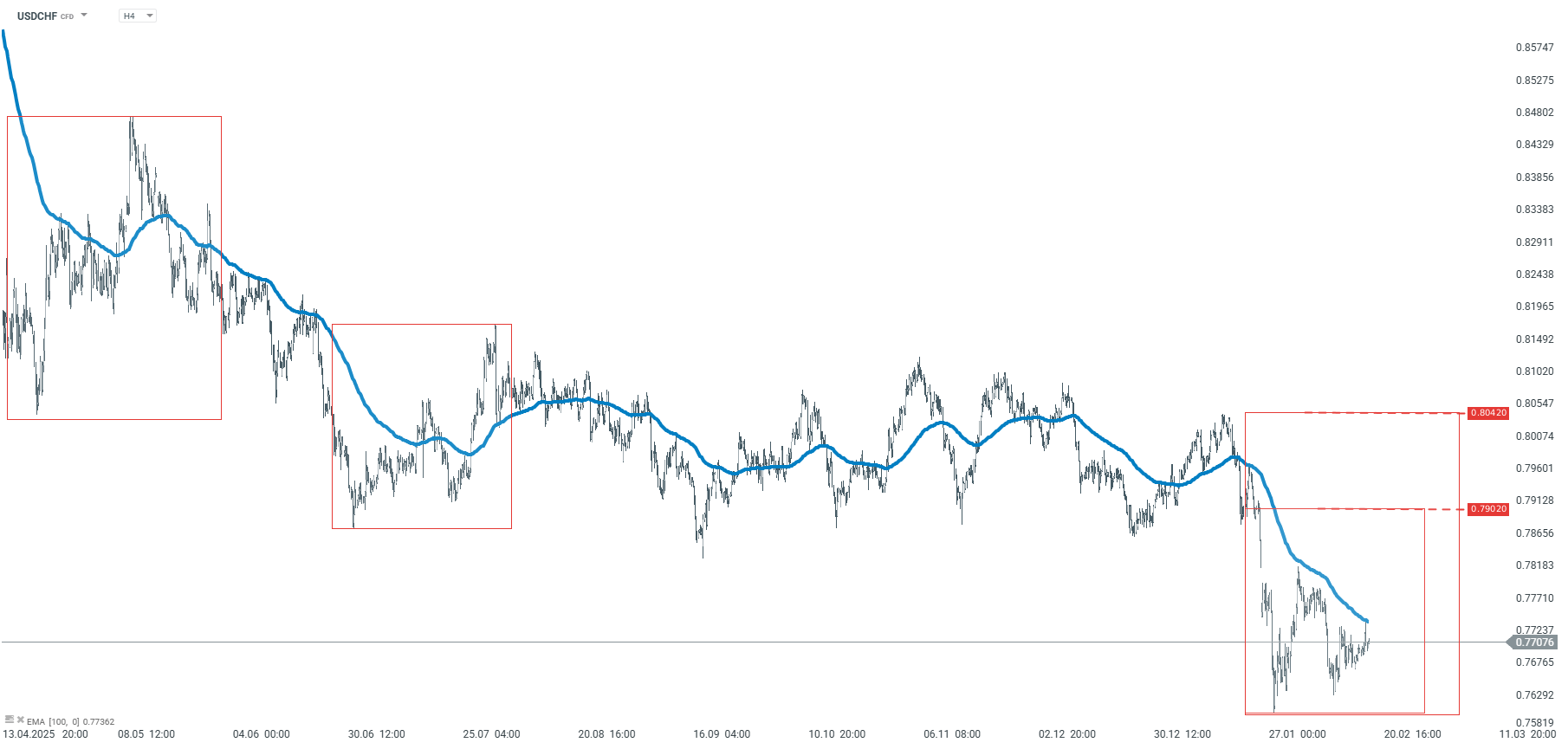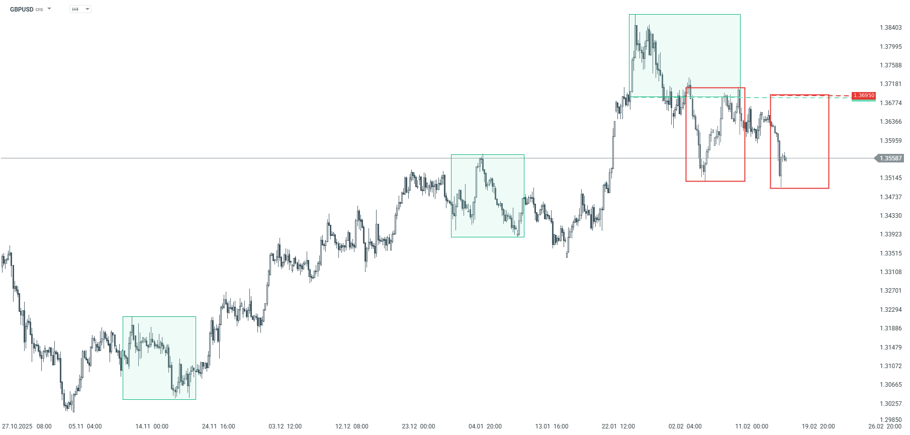 Les cotations GBPUSD ont évolué dans une tendance haussière pendant longtemps, mais début février, le modèle haussier 1:1 (marqué par un rectangle vert) a été invalidé. Le prix a ensuite testé le modèle brisé de l'autre côté, ce qui a conduit au début d'une nouvelle vague baissière. Actuellement, la résistance clé se situe dans la zone 1,3690, où se regroupent à la fois la polarité de la géométrie 1:1 annulée et les niveaux significatifs résultant des modèles géométriques locaux. Selon la méthodologie Overbalance, tant que le prix reste en dessous de cette zone, le scénario de base reste une poursuite de la baisse. D'autre part, un retour durable au-dessus de 1,3690-1,3695 pourrait ouvrir la voie à une nouvelle tentative d'atteindre les sommets de janvier dans la zone 1,3750.