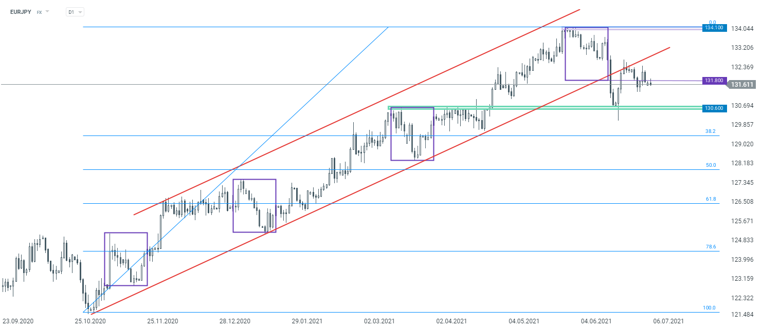 La paire EURJPY évolue dans une tendance haussière depuis le début du mois de novembre. Néanmoins, en regardant l'intervalle D1, les premières indications d'un renversement de tendance ou d'une plus grande correction à la baisse sont apparues. En se référant à la méthodologie Overbalance, la configuration de la plus grande correction (rectangles violets) a récemment été annulée, ce qui peut indiquer que les vendeurs prennent l'initiative. En outre, le mouvement haussier a clairement perdu son élan, ce qui a entraîné une cassure sous la limite inférieure du canal ascendant, ce qui, selon l'analyse technique classique, favorise également les baisses du marché.