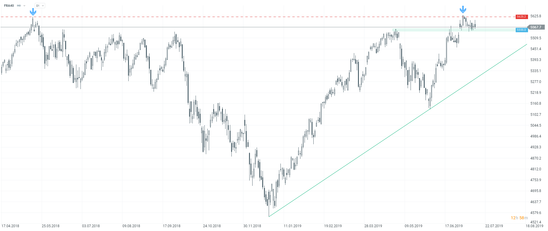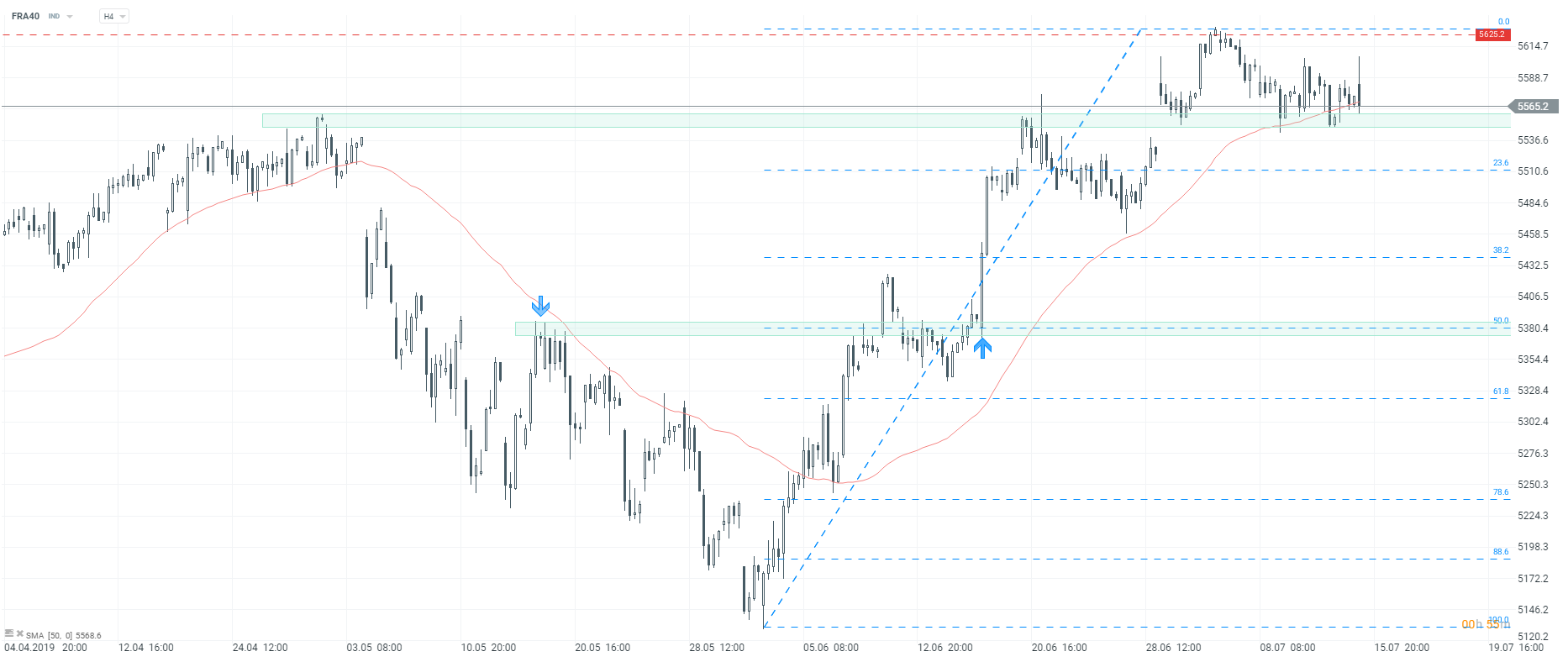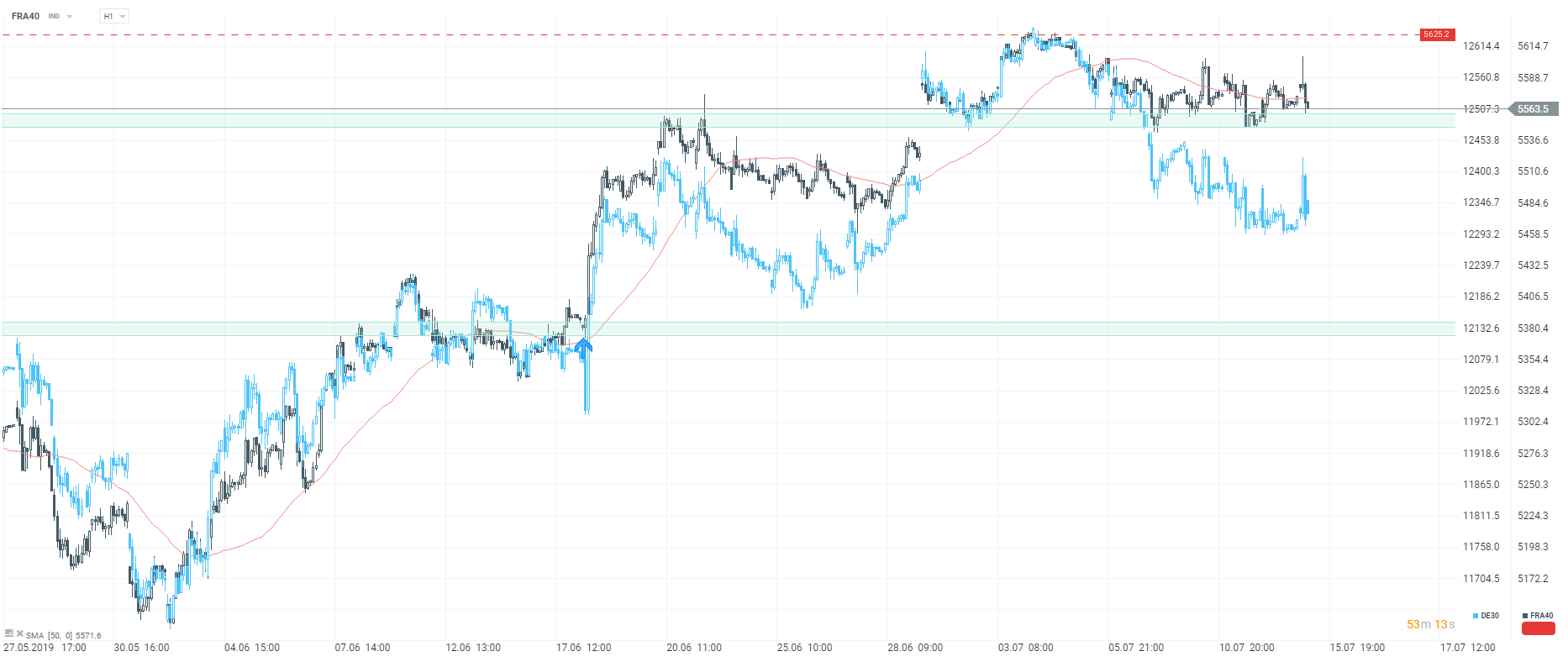 Nous avons mentionné au début de l'analyse que la bourse allemande s'était légèrement détériorée ces derniers temps. Cela se voit lorsque nous superposons les graphiques des deux instruments. Comme on peut le constater, le DAX allemand a nettement baissé la semaine dernière, tandis que le FRA40 français est resté dans une zone de consolidation. En cas de sentiments trop pessimistes sur les marchés actions allemands, les autres indices européens pourraient être aussi aspirés à la baisse. Dans un tel scénario, le franchissement (à la baisse) des 5 555 points pourrait être en danger.