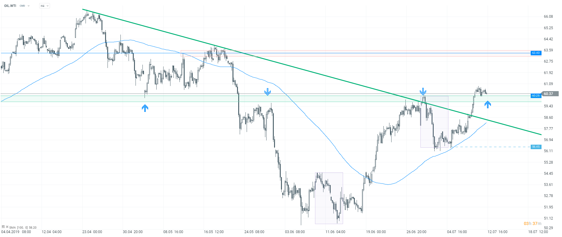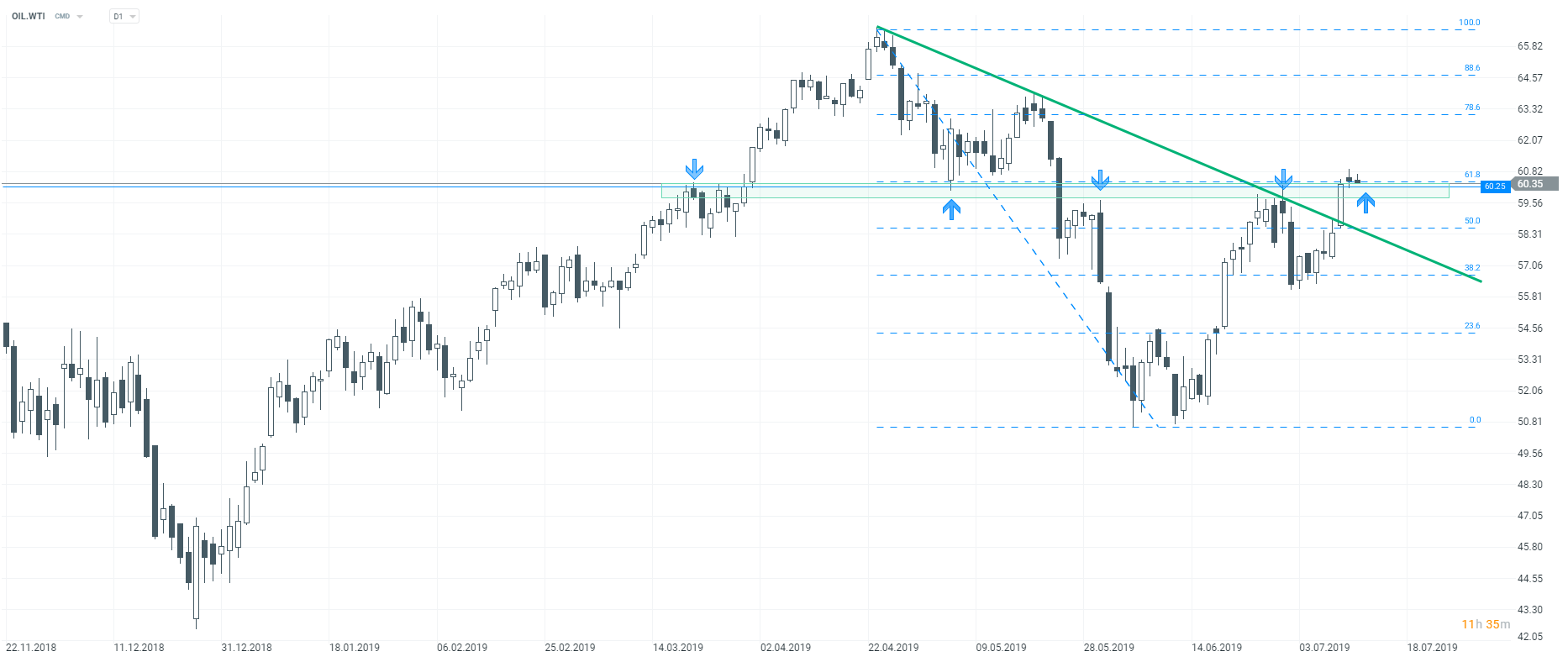 Il s'est passé beaucoup de choses sur le marché du pétrole ces derniers jours. Mercredi, nous avons pu observer une hausse des prix du pétrole de plus de 4% en raison des tensions croissantes dans le détroit d'Hormuz et de la baisse plus importante que prévu des stocks de brut annoncée par le Département de l’Energie. Aujourd'hui, le pétrole WTI se négocie à 60,50 $. En regardant l'intervalle journalier, on peut voir que la zone de résistance principale a été franchie. La zone située autour des 60,25 $ est marquée avec quelques hauts et bas, et le niveau des 61,8 % des retracements de Fibonacci peuvent également être trouvés ici. De plus, les prix ont dépassé la ligne de tendance baissière (couleur verte sur le graphique ci-dessous), ce qui laisse supposer que la tendance s'est inversée.